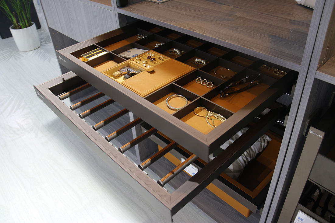 除了人間煙火氣,當(dāng)然還少不了高雅氣。星徽為大家?guī)?lái)的衣柜功能五金系列,可謂想您所想,像全皮飾品盒、全皮衣物籃、全皮褲架等產(chǎn)品,馬鞍橙搭配星巴咖,完美地闡釋了優(yōu)雅格調(diào)與實(shí)用主義的融合,將紛繁復(fù)雜的小物件分隔收納,化繁為簡(jiǎn),更具藝術(shù)性和兼容性,亂“室”佳人秒變精致女神。
