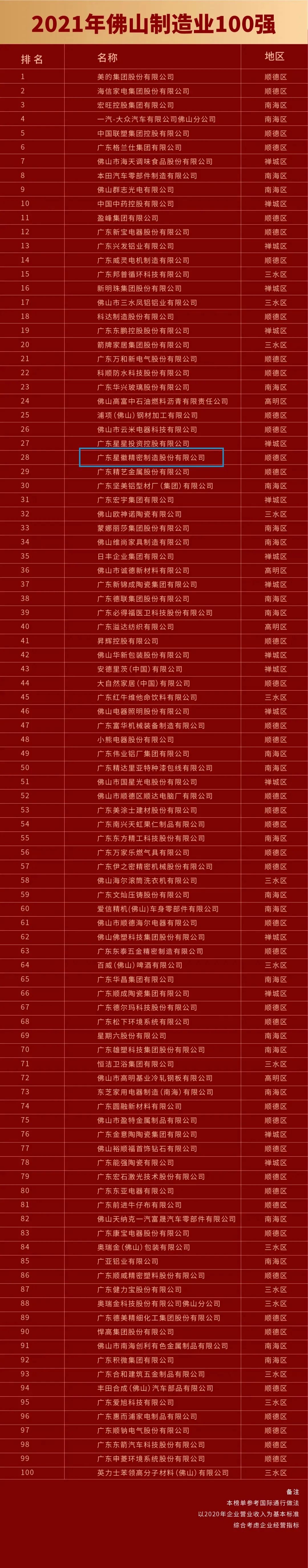 “佛山企業(yè)100強(qiáng)”榜單和“佛山制造業(yè)100強(qiáng)”榜單參照世界500強(qiáng)、中國(guó)企業(yè)500強(qiáng)、廣東企業(yè)500強(qiáng)等榜單的評(píng)選方式,評(píng)比過(guò)程權(quán)威、公正、公開(kāi),也得到了社會(huì)各界的高度認(rèn)可。相比較去年星徽精密今年排名上升23位,進(jìn)一步確立了星徽精密在行業(yè)中的領(lǐng)先地位。
