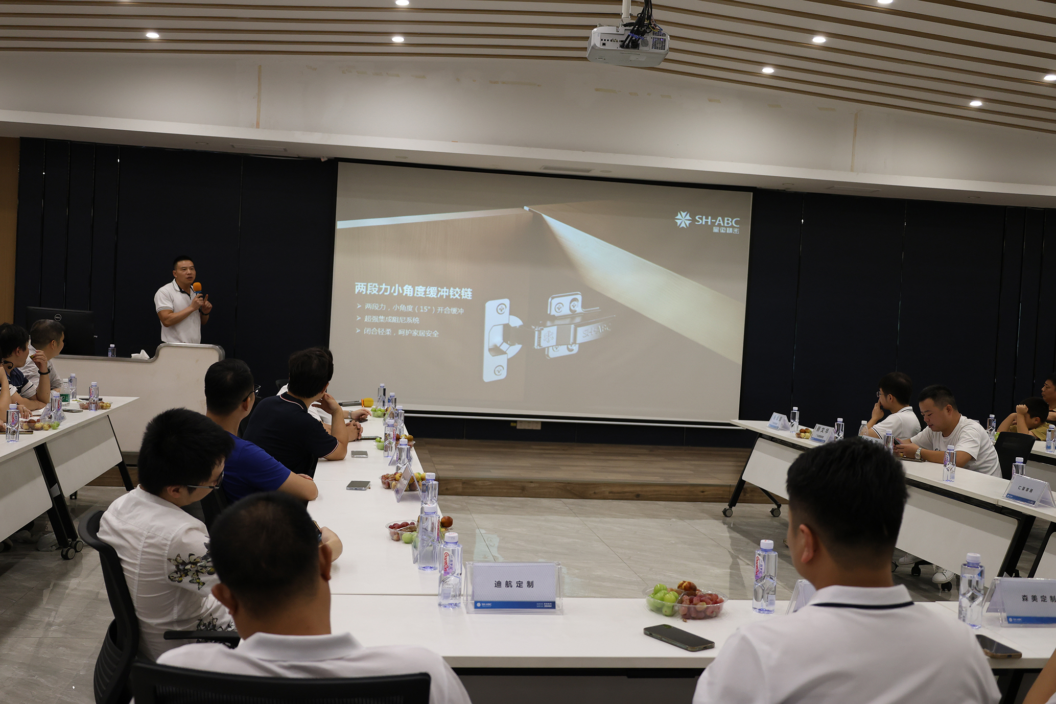 在座談會上,星徽精密市場部楊維國首先熱烈歡迎惠州家具行業(yè)協(xié)會成員一行的到來,并對協(xié)會長期以來對星徽精密的關(guān)懷和支持表示衷心感謝。隨后分享了燈光騎馬抽屜、上翻系統(tǒng)、兩節(jié)全展隱藏滑軌等星徽精密特色產(chǎn)品及星徽精密未來三年的戰(zhàn)略規(guī)劃。